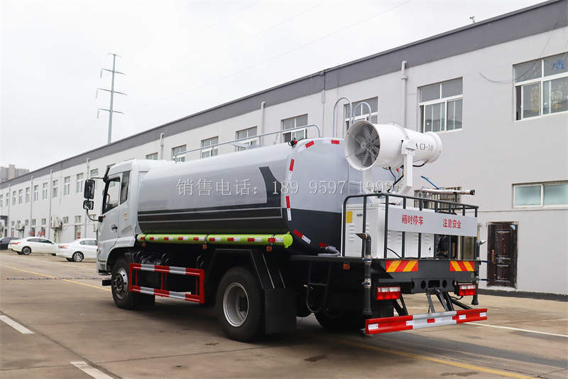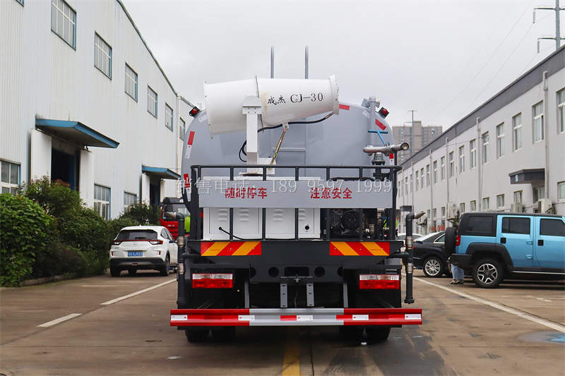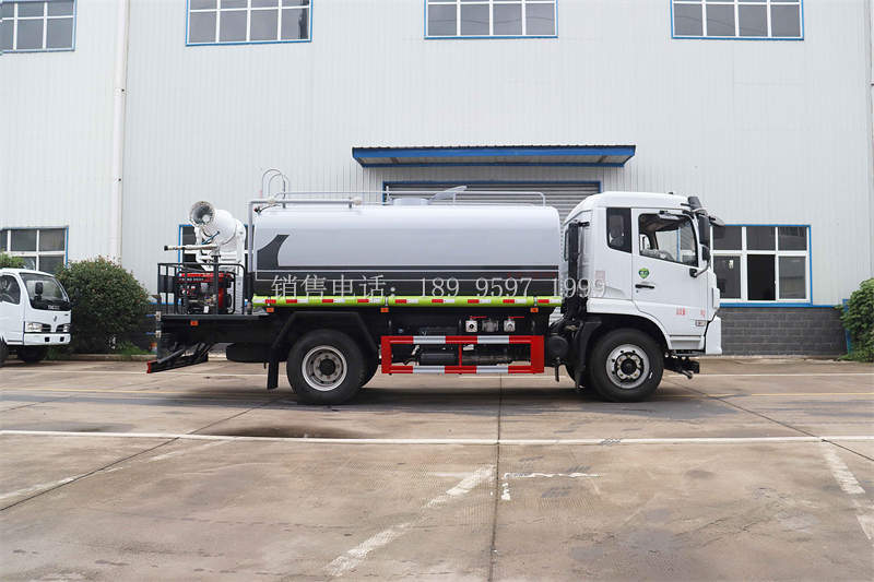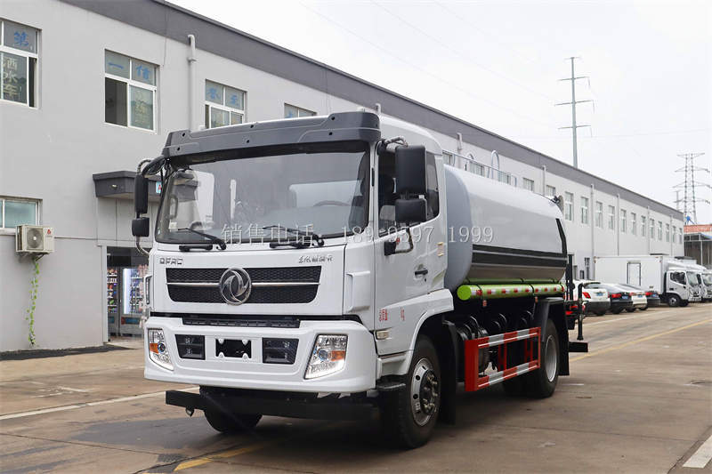 【13方东风F9福瑞卡环卫绿化洒水车上装配置】罐体用4 mm武钢碳钢板制作,罐体容积12立方,罐内隔板具有防波作用,专用自排自吸洒水泵,前冲、万向鸭嘴、后洒、侧喷、高位花洒、后工作平台、360度可调节绿化水炮,高压冲洗机、自流阀、滤网、消防接口(可连接消防栓取水,可作应急消防用),罐前量管(观察罐内水位)、罐后爬梯、罐上罐口、带简易护栏、抽水管两根,罐体表面双层油漆工艺开选装大功率雾炮。