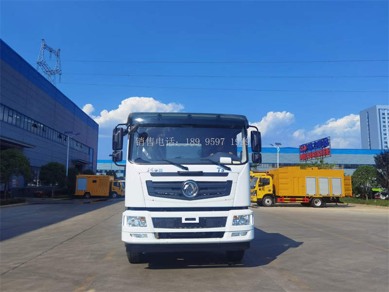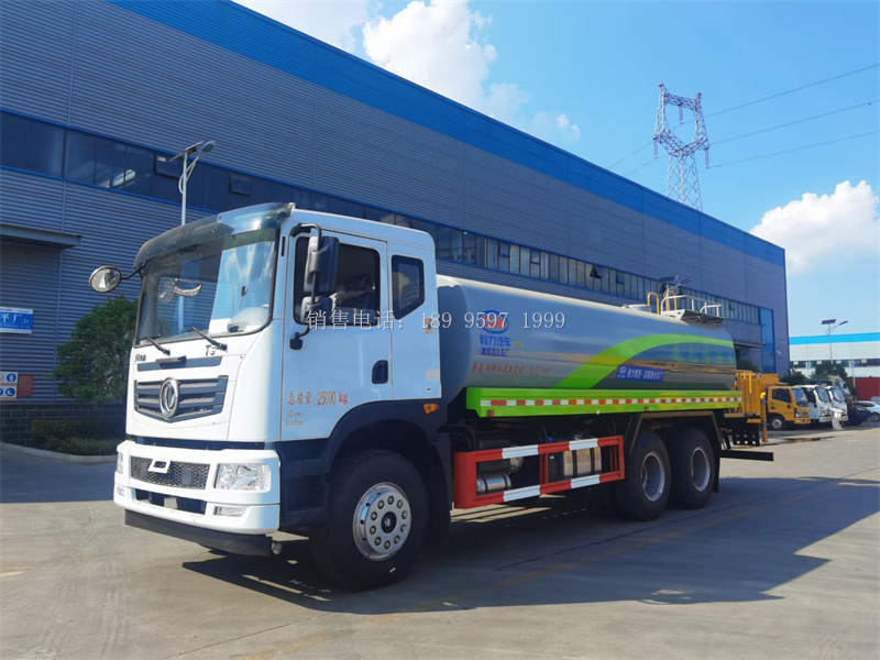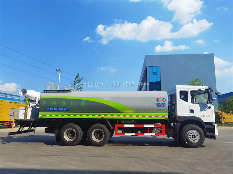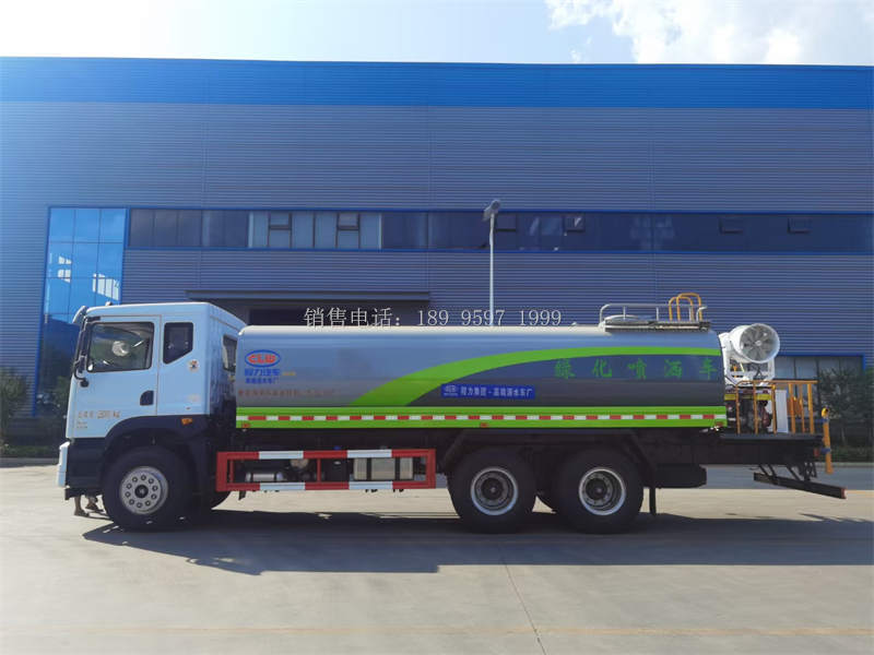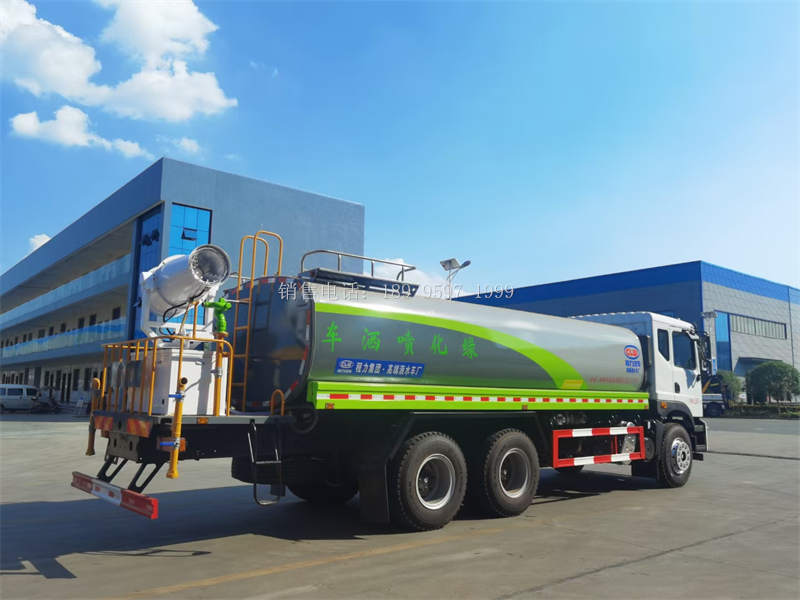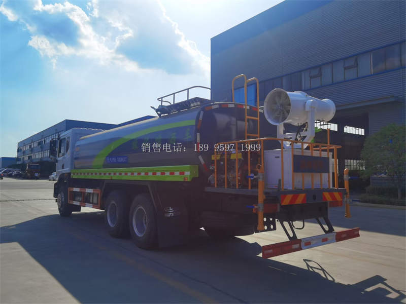 国六20吨东风T5后双桥多功能雾炮洒水车洒水车专用性能:前冲(喷)后洒、带侧喷、带后工作平台、平台上安装绿化洒水高压炮(炮 喷射形状可调:直冲状、大雨、中雨、毛毛雨,可连续调节,最大射程可达 30 米),配备大功率专用洒水泵,带消防接头,带自流阀,带自吸功能,带 滤网。吸程≥6 米 洒水宽度≥16 米 射程≥30 米。