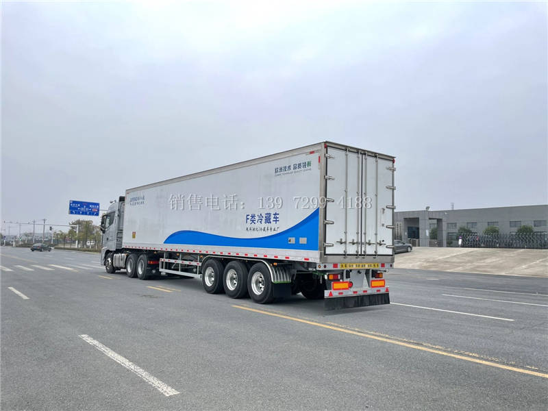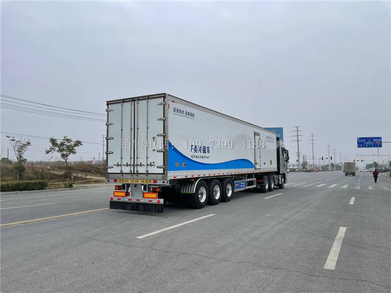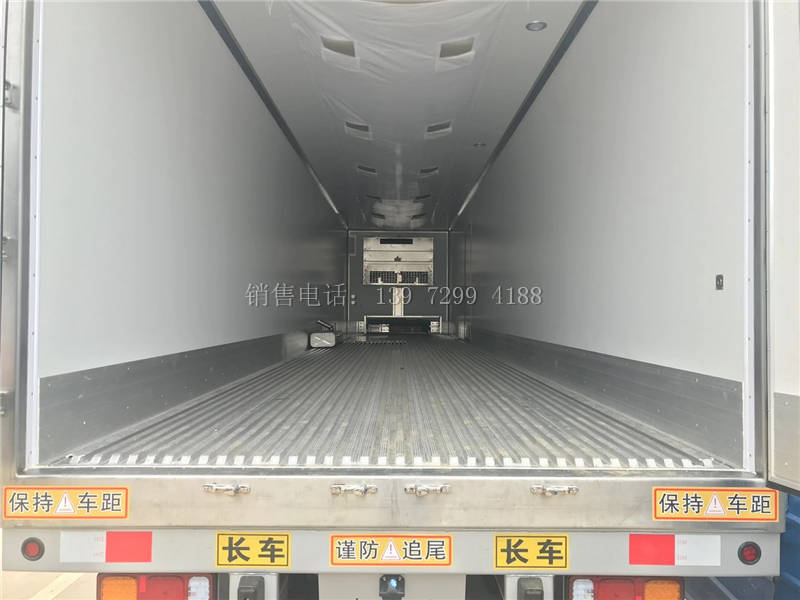 二、厢体配置:13.6半挂冷藏车箱体是采用先进的木质工艺、断桥隔热技术!箱板是由镀锌管骨架加上环保防水木板用螺丝连接,中间8CM保温板填充、内外2.0玻璃钢,高强度粘合剂,热压成型,外框采用304不锈钢、加厚铝型材包边、27不锈钢大门锁、配件,箱体拼接出来不打胶无缝隙,降温速度快、散温慢、保温效果好,门带斜边,副梁是510大梁钢一次性折成,用压板锁紧,侧护网和后保险杠一次性成型,用螺丝锁紧。(肉钩车采用400mm排版,箱体承载力更强)