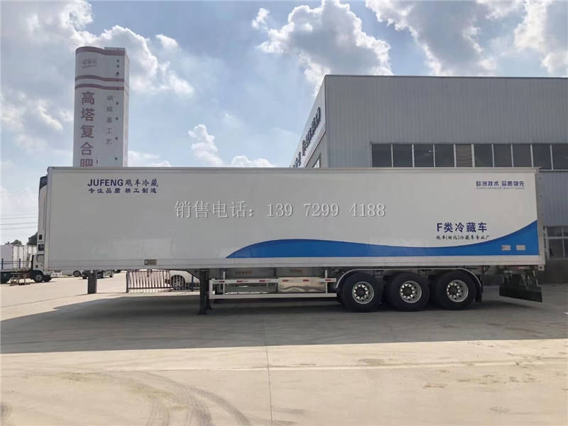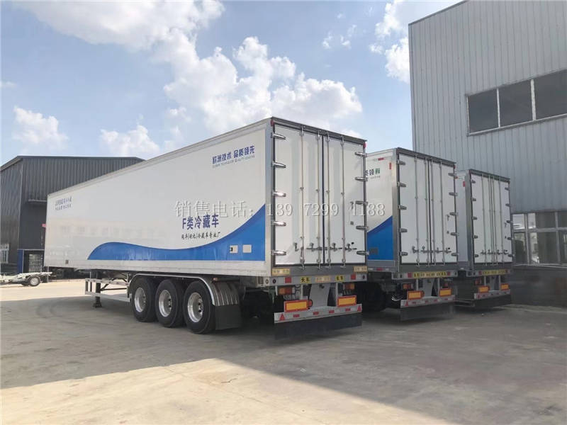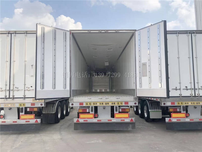 13米6三桥大型一体挂铝柜半挂冷藏车配置:采用欧洲技术,整体开放式发泡工艺保温厢板,一体挂(有纵梁)配置;(有效容积81.2个立方).箱体材质:外全铝蒙皮,内热缩板,底板加厚通风槽、箱体内部顶板加装通风布,行走部分为13吨3轴富华桥(钢板式),二个备胎架含1个备胎,铝护栏,铝保险杠,铝气罐+托盘,进口约斯特双联动支腿、双钱轮胎12R22.5,左右两侧40公分护板-围裙,后马蹄焊连,加厚型铝合金大包边,后门双杠,其他按挂车标准,《选装为:铝合金工具箱+铝合金轮圈+冷机铝合金隔板+单侧门》。
