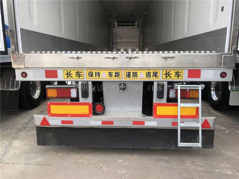 二、厢体配置:13米6三桥大型一体挂铝柜半挂冷藏车是采用先进的木质工艺、断桥隔热技术!箱板是由镀锌管骨架加上环保防水木板用螺丝连接,中间8CM保温板填充、内外2.0玻璃钢,高强度粘合剂,热压成型,外框采用304不锈钢、加厚铝型材包边、27不锈钢大门锁、配件,箱体拼接出来不打胶无缝隙,降温速度快、散温慢、保温效果好,门带斜边,副梁是510大梁钢一次性折成,用压板锁紧,侧护网和后保险杠一次性成型,用螺丝锁紧。(肉钩车采用400mm排版,箱体承载力更强)
