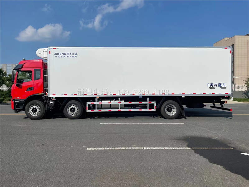 国六东风天锦kr小三轴9.6米前四后四冷藏车价格咨询13972994188陆经理,该车型采用东风商用车有限公司原厂底盘,新款东风天锦KR高顶驾驶室、电动液压翻转、半浮式驾驶室、可乘坐3人,DDi75E300-60型龙擎300发动机 功率/马力:220(kw)/299.2(ps),法士特9速高低挡变速箱。
