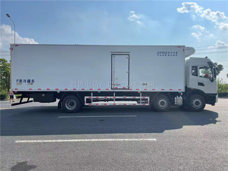 东风天锦kr小三轴9.6米冷藏车侧门框外包 PVC 材质;后门包边为 PVC 材质(传热系数低),三元乙丙橡胶弹性纯黑色密封条(5道密封条+铝合金压条)+加厚型不锈钢合页及锁件,副梁为 Q710 车用大梁钢,箱体内前端加装 2 个排水孔;加装后门框断桥隔温黄色胶条。