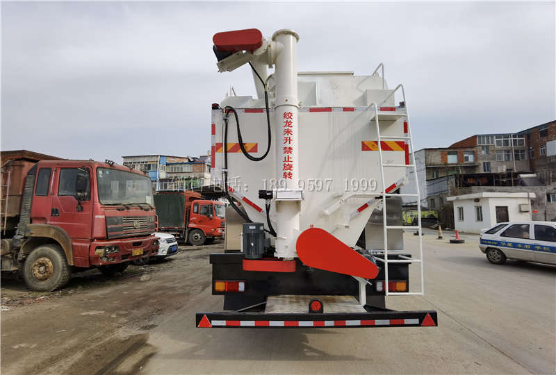 散装饲料车罐体全部车型标配铝合金仓盖,重量超轻,省力,铝合金防滑板,15吨以上散装饲料车全部车型车身两侧标配铝合金防护保险杠。