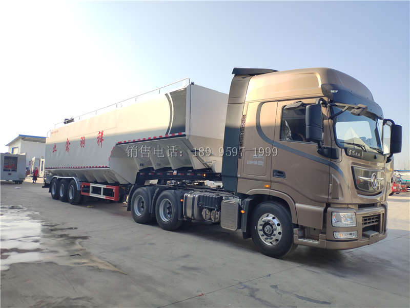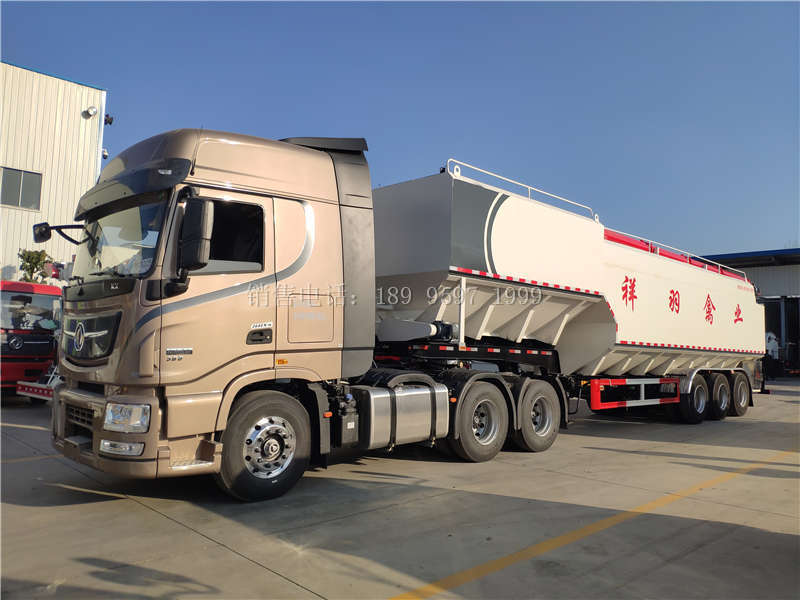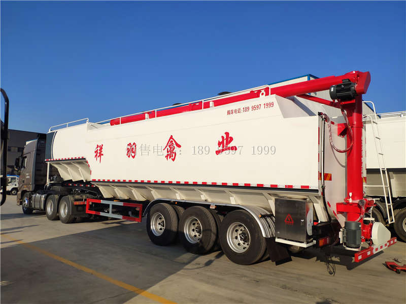 13米半挂散装饲料运输车行走采用广州13吨富华桥,轮胎型号12R22.5 12PR,罐体配置:罐体采用轻量锰钢焊接而成,罐体容积64.8立方,罐体尺寸 12980*2550*3998mm,罐体内分5个独立隔仓。卸料绞龙长度8.2米,由4个5.5KW 的(进口)西门子电机驱动,不锈钢工具箱。380v外接电源,带动各绞龙工作(底部水平绞龙,垂直绞龙,出料绞龙),顶部出料绞龙由营迎压控制举升,绞龙可左右旋转180度,可以独立控制各分仓卸料顺序和速度。散装饲料车厂家:18995971999谢经理。