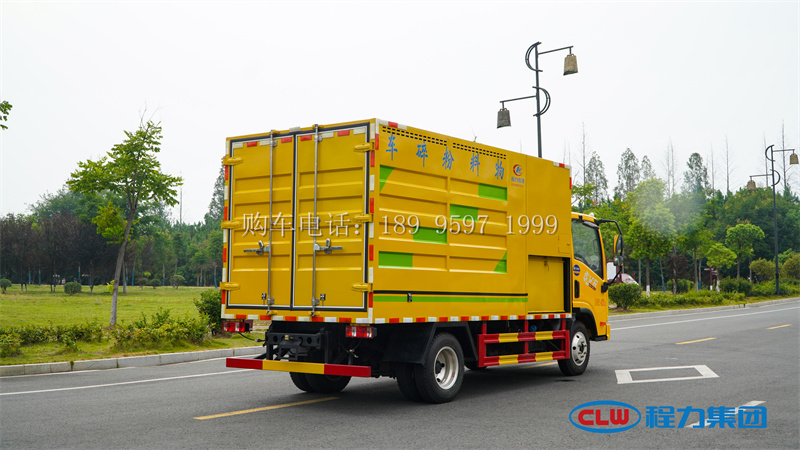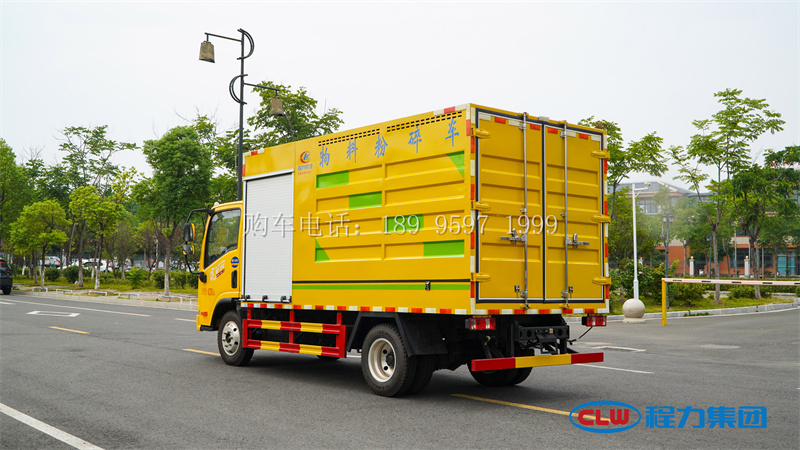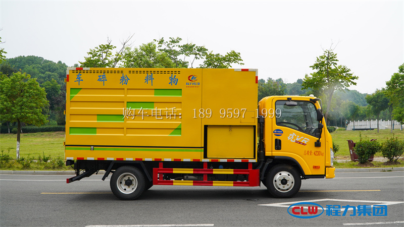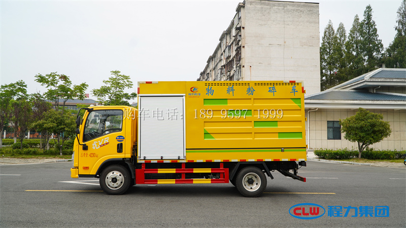 11方解放物料树枝粉碎车底盘采用解放虎 VR3300 轴距底盘,全柴 130 马力发动机,万里杨 5 档变速箱,电动门窗,遥控中控锁,电动空调,铝合金轮辋。上装由一台 900 型粉碎机和料仓及出料装置组成。粉碎机由底盘上安装的分动箱带动,不需副发动机,粉碎的料由喷口喷入料仓,料仓底部有出料铰茏,由液压马达驱动,也可选装后翻自卸。整车电控系统采用人机界面加运动控制器组合,能精准显示粉碎机转速,智能控制给料速度。