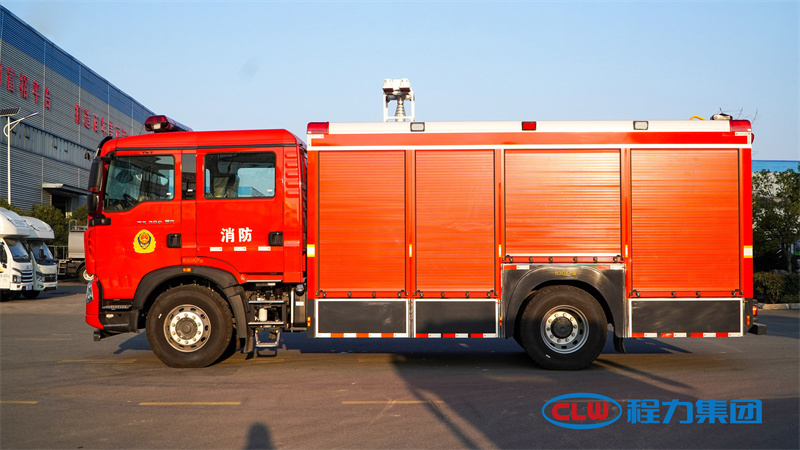 驾驶室顶部配备长排豪华红色警灯。车辆两侧上方配有爆闪灯,下方安装安全标志灯和侧回复反射器(组合式),配有后示廓灯,器材箱内装有照明灯,并符合 GB4785 规定。警报器、警灯、爆闪灯电路为独立式附加电路,控制器件安装在驾驶室内。快速充电装置:该车配有消防车快速启动保障系统,可对消防车实施充电功能,保障消防车快速出警。