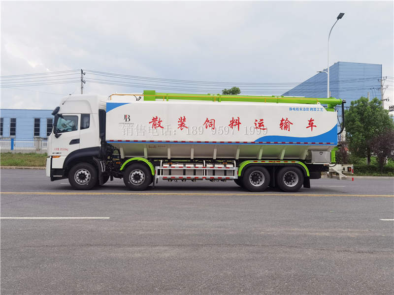 20吨东风天龙KL前四后八散装饲料运输车上装配置:罐体材质采用3mm高强锰钢板,整车3条绞龙,有3个液压马达(美国伊顿)带动卸料,顶部绞龙液压控制举升,左右旋转由1个液压马达,可左右旋转180°,罐体可根据用户要求做多个独立分仓,可独立控制各分仓卸料顺序和速度,卸料管倾斜60度,垂直卸料高度9米,整整车卸料完用时20分钟 。可选装电动动控制,车载发电机,绞龙加长。油漆工艺 钢材抛丸处理,表面皮膜处理,静电粉末涂装,220度高温烘烤,常温冷却.(耐高温,耐酸碱,质保三年)。