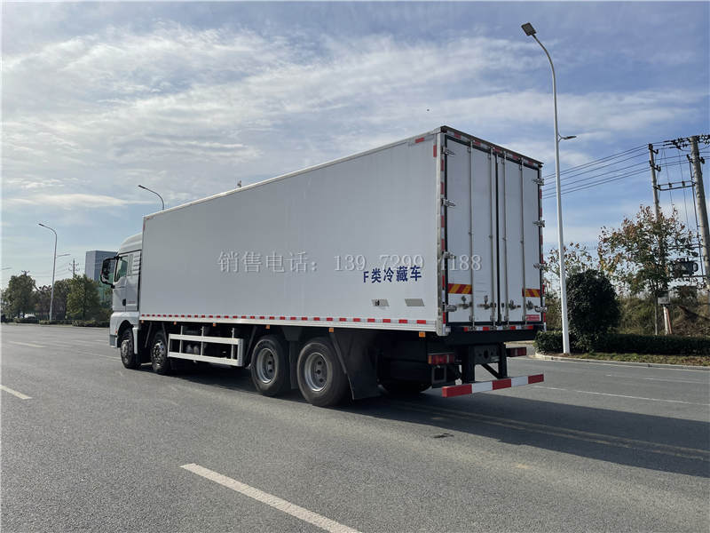 前四后八9米6重汽汕德卡G7肉钩冷藏车承载力方面,前桥采用的是VPD71DS前桥,后桥采用的是MCY12BGS自调臂双后桥,前盘后鼓,后桥速比为2.85;这一速比主要针对的是平原高速路况,如果跑国道或者山区比较多,可以选择3.08后桥速比。