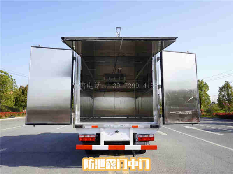 (5)、车辆具有密闭、防渗、防尘等性能;具备抗菌、阻燃、耐腐蚀、易清洗消等功能。厢体内部安装有自动喷雾装置,可进行自动喷雾消毒,杀菌。采用低温杀毒,紫外线杀毒,喷雾杀毒。