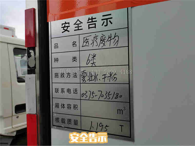 (8)、医疗废物转运车厢体前、后和两侧设有医疗废物专用和警识标识。驾驶室两侧喷涂医疗废物转运单位名称。