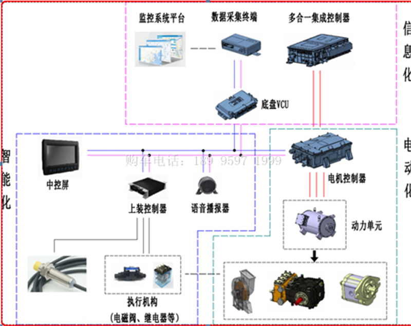 采用7.0寸采用带触摸功能的中控屏控制,防护等级IP65,分辨率800*480TFT。监控接近开关、传感器信号状态;上装故障代码显示;上装电机、电控电参数监控和显示等功能;IO手动模式,当车辆维修、调试时使用IO手动模式,执行机构动作不受传感器逻辑判断。