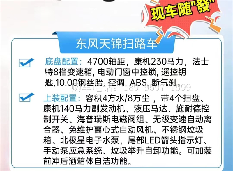 出口型东风天锦扫路车上装配置:容积4方水/8方尘 ,带4个扫盘、康机140马力副发动机、液压马达、施耐德控制开关、海普瑞斯电磁阀组、无级变速自动离合器、免维护离心式自动风机.