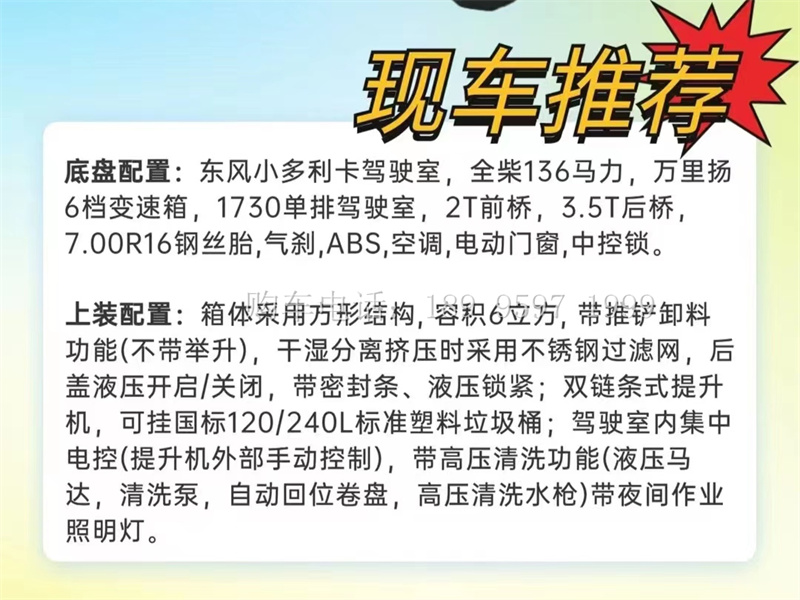 出口型东风小多利卡6方餐厨垃圾车上装配置:箱体采用方形结构, 容积6立方, 带推铲卸料功能(不带举升),干湿分离挤压时采用不锈钢过滤网,后盖液压开启/关闭,带密封条、液压锁紧;双链条式提升机,可挂国标120/240L标准塑料垃圾桶;驾驶室内集中电控(提升机外部手动控制),带高压清洗功能(液压马达,清洗泵,自动回位卷盘,高压清洗水枪)带夜间作业照明灯。