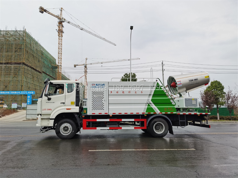 13方重汽豪沃单桥100米雾炮抑尘车上装配置:罐体满载容积13立方,前喷,后洒,侧喷,高炮,带工作平台,平台加装华力100米风筒式雾炮,前冲、后洒气动阀驾驶室自动控制(采用气动球阀优势:1.操作方便,能及时避让行人及特殊情况。2.避免车辆停止状态水资源被随意流失浪费。3.由于前冲后洒管道离地低,方便后期罐体无泄漏维修)。