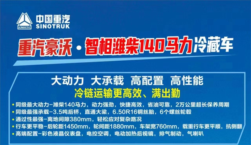 小型3米8蓝牌重汽豪沃智相跨界冷藏车整车配置:轴距:3120mm,货箱尺寸:3750/3800×1740/1800×1650/1740/1750mm,整车型号:ZZ5047XLCF3111F1451760mm车身、5档变速箱、潍柴140马力、6.50R16钢丝胎(6螺丝轮毂)、电动带加热后视镜、空调、皮座椅、动转、ABS、中控锁、电动门窗、遥控钥匙、电控气喇叭、内置导轨肉钩不超重。