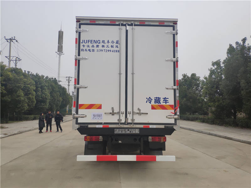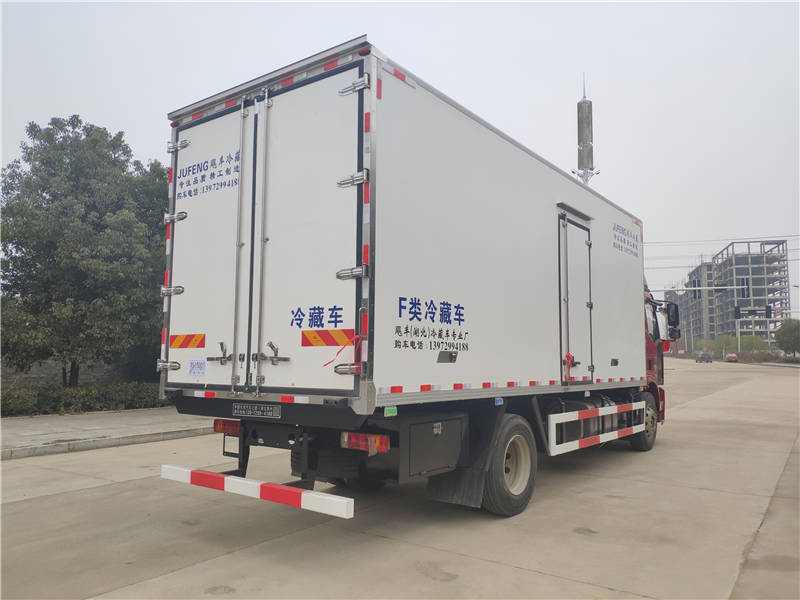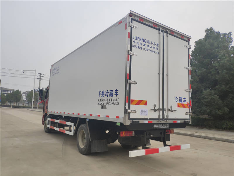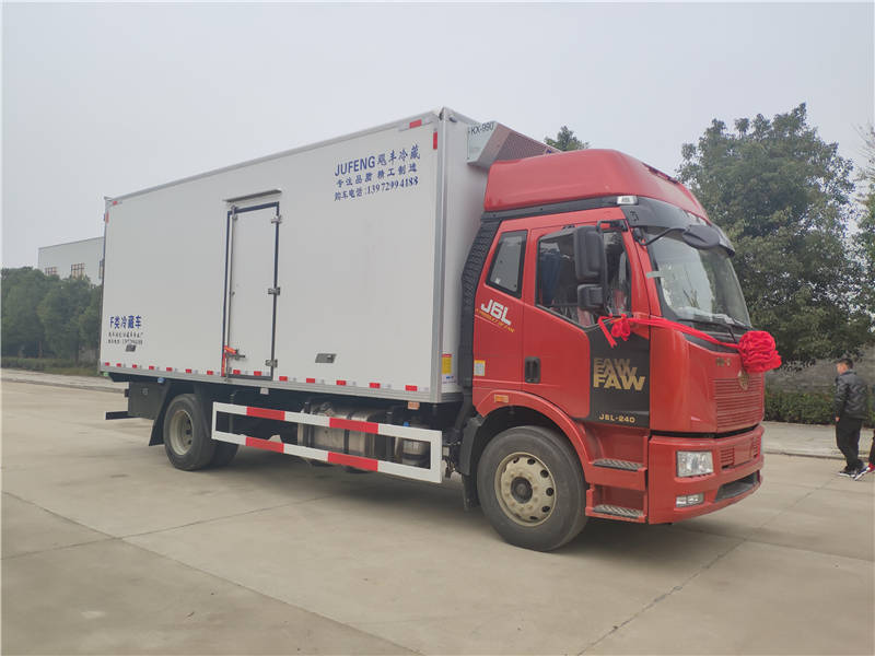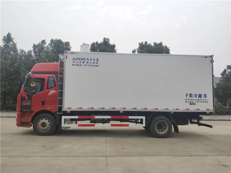 6米8解放J6L中型单桥肉钩冷藏运输车箱体是采用先进的木质工艺、断桥隔热技术!箱板是由镀锌管骨架加上环保防水木板用螺丝连接,中间8CM保温板填充、内外2.0玻璃钢,高强度粘合剂,热压成型,外框采用304不锈钢、加厚铝型材包边、27不锈钢大门锁、配件,箱体拼接出来不打胶无缝隙,降温速度快、散温慢、保温效果好,门带斜边,副梁是510大梁钢一次性折成,用压板锁紧,侧护网和后保险杠一次性成型,用螺丝锁紧。(肉钩车采用400mm排版,箱体承载力更强)。