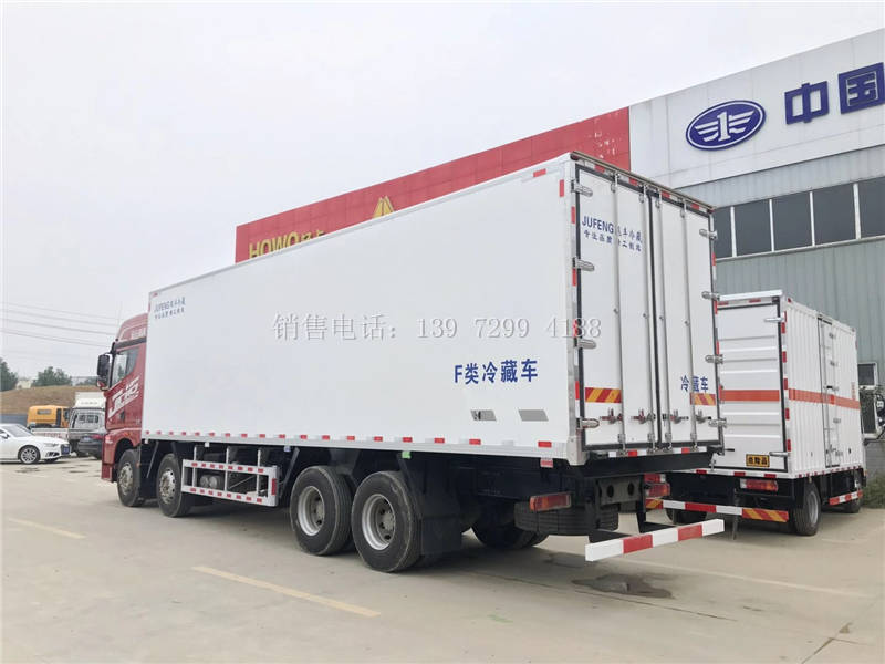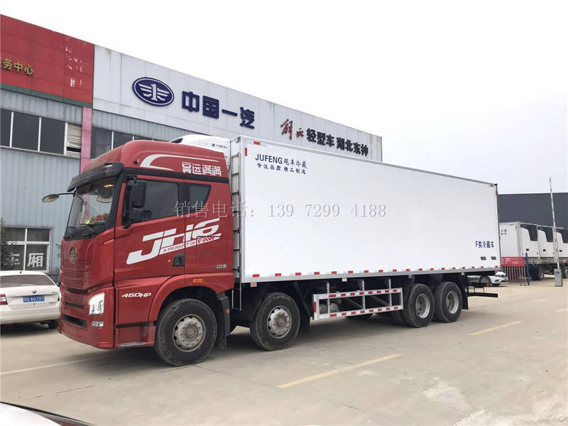 9米6解放J6P前四后八肉钩冷藏车底盘配置:采用中国第一汽车集团有限公司原厂底盘,新款解放JH6全浮高顶四点空气悬浮驾驶室,潍柴400马力发动机,法士特12档变速箱,大排半平地板卧铺(宽度850mm)气囊多向调节座椅、 电动举升翻转、 电动后视镜,后视镜加热 电动门窗,中控门锁, 自动空调、10寸智能触屏显示屏,车载WIFI,多功能方向盘,车联网服务/车载信息服务终端总成;GPS北斗行车记录仪.发动机体现10万公里长换油周期.435升级冲焊桥;后桥允许载荷:18000(二轴组)Kg;后桥速比为3.727;有ABS;有刹车自动调整臂;气刹(断气);骆驼150AH蓄电池/220V电源;600L铝油箱;TRW方向机;WABSO离合助力器;电控硅油风扇离合器;全车WABCO阀:;驾驶室前下防护;车载WIFI;PKC线束;其它标配。冷藏车厂家13972994188陆经理