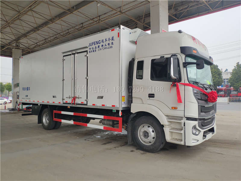 江淮冷藏车底盘配置:江淮格尔发7米8冷藏车采用高顶双卧玉柴6缸240马力发动机(YC6JA240-50),8档变速箱,11.22.5 18PR真空胎,,300L铝合金油箱,断气刹,原装空调,ABS,电动门窗,行车记录仪。江淮格尔发7米8冷藏车厂家:13972994188陆经理.