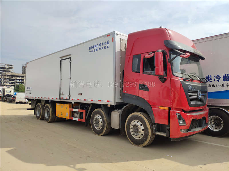东风天龙KL前四后八9米6冷藏车东风天龙KL前四后八9米6冷藏车,雷诺465马力发动机,法士特12档变速箱,整车尺寸11980×2600×3990mm,冷厢内空9400×2440×2450mm,厢体内部容积约为56立方,空车自重13.6吨,可荷载17.2吨。