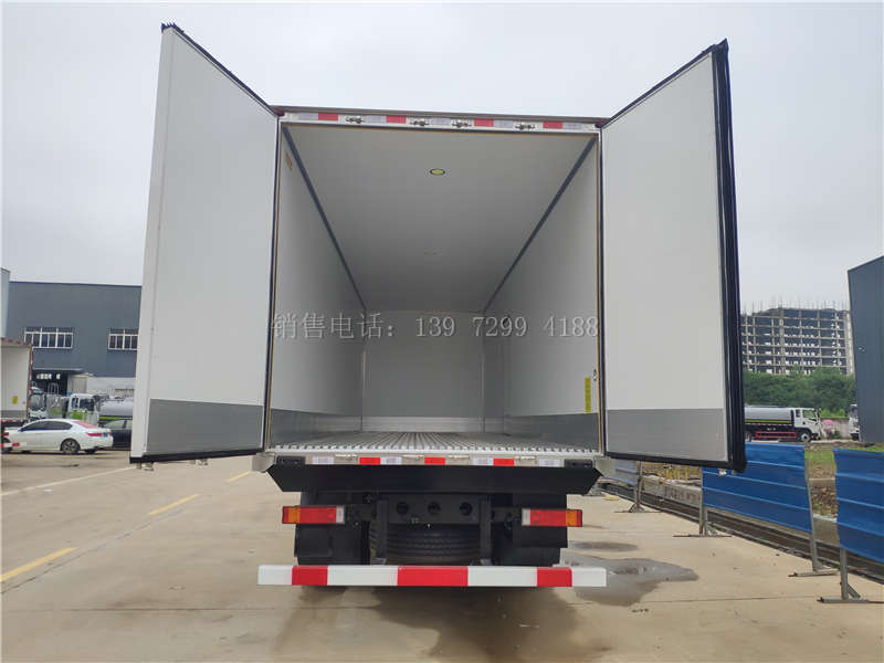国六东风冷藏车小三轴9米6的价格随底盘选装前雾灯,选装侧窗玻璃,驾驶室顶部选装导流罩,选装车门裙板,选装无车门裙板,选装与车身颜色相同的前保险杠,选装侧转向灯,选装前下视镜,选装高顶驾驶室;厢体顶部封闭,不可开启,侧面选装开门和不开门,选装厢体结构,选装后处理结构形式,选装储气筒位置,选装其它厂家功率相当的制冷机组,选装前置式,底置式制冷机组;选装尾板,尾板质量为550kg,尾板收起状态时的水平长度为295mm;选装尾板时仅选用断面尺寸Φ121mm的后防护,后防护材质:Q235,连接方式:焊接,离地高度470mm;侧防护:材质Q235,螺栓连接,后下防护:材质Q235,螺栓连接,断面尺寸120×60mm,离地高度480mm,460mm,440mm。