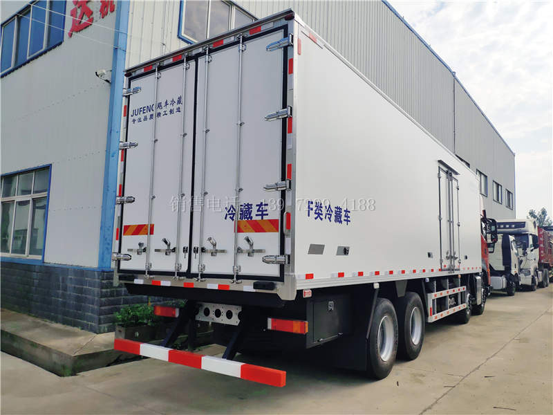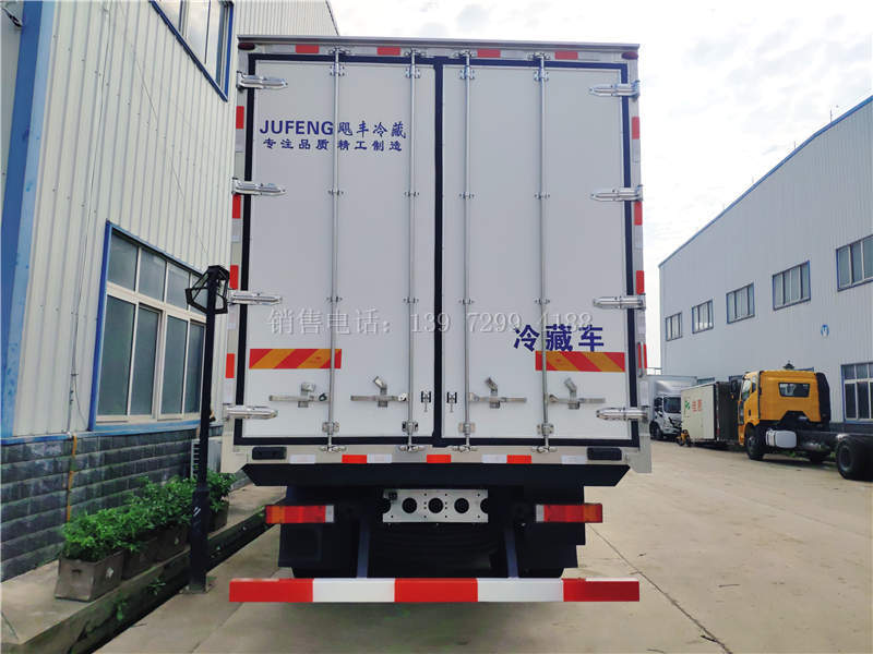 东风9米6冷藏车箱板是由镀锌管骨架加上环保防水木板一次成型,中间8CM保温板填充、加厚3.0玻璃钢,高强度粘合剂、热压成型,外框采用304不锈钢、加厚铝型材包边、27不锈钢大门锁、配件,箱体拼接出来不打胶无缝隙,降温速度快、散温慢、保温效果好,门带斜边,副梁是910大梁钢一次性折成,用压板锁紧,侧护网和后保险杠一次性成型。