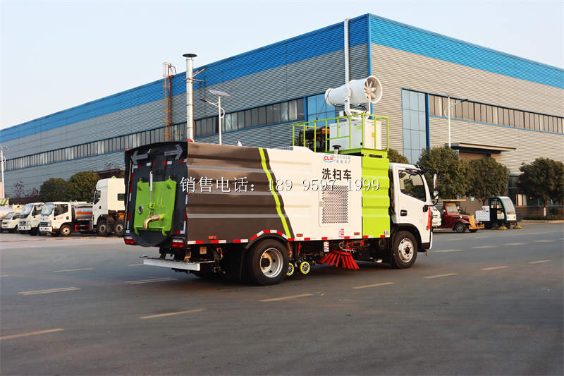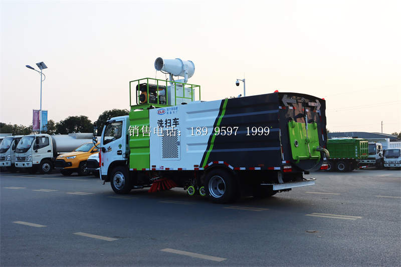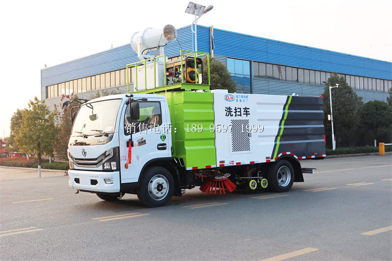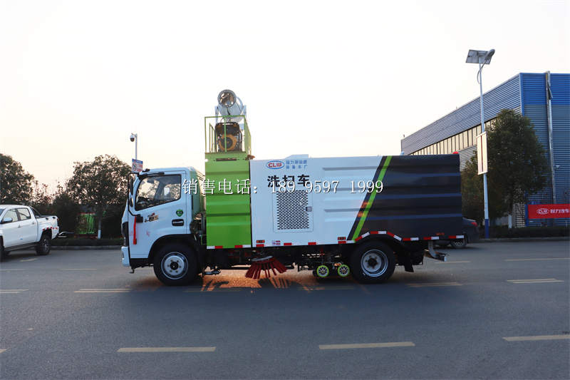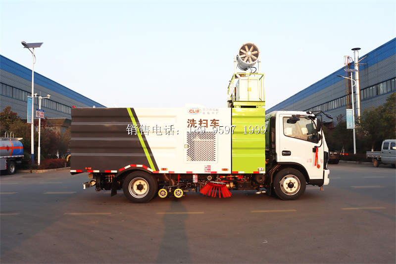 国六东风大多利卡D7多功能洗扫车上装配置:清水箱(4立方)、垃圾箱(5立方)、左立右扫、带水喷杆的宽吸嘴、低冲压洗系统、扫降盘尘系统、液系压统、专用装电置控系统和车副架等改而装成,副发机动采用康明斯140马副力发动机,带2个置中扫盘,液压马达;GTM高水压泵;高压路清沿洗喷头,低压泵(前冲);不钢锈垃圾箱;不钢锈管高压管路;PLC一键控制;尾部LED箭头灯;垃圾箱、水均箱带防溢低位水报警装置;倒及车洗扫态状室内监视器。